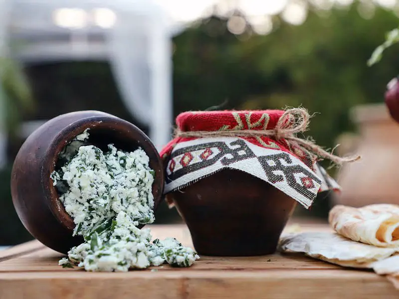 Eghegnadzor, a soft goat cheese with the addition of mountain herbs, is aged in clay pots, making it particularly aromatic and unique. Most often it is flavored with mountain aromatic dried thyme. In stores, Eghegnadzor cheese can be found in beautiful clay pots. This cheese does not have a uniform consistency: it is crumbly, resembling cottage cheese. It pairs very well with fresh tomatoes, so one way to enjoy it is to sprinkle eghegnadzor on a salad of tomatoes and greens. It can also be wrapped in fresh Armenian lavash and served with an assortment of greens.