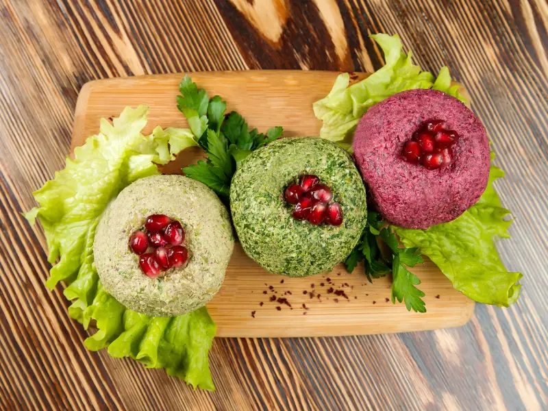 На традиционном грузинском столе обязательно подаются закуски из овощей. Главной овощной закуской считаются рулетики из баклажана с начинкой из ореха, сметаны и чеснока. Подаются также яркие шарики пхали из шпината и свеклы, лобиани – лепешки с фасолью и ассорти из грузинских сыров. Кстати, орехи очень часто добавляются в блюда, салаты и выпечку.