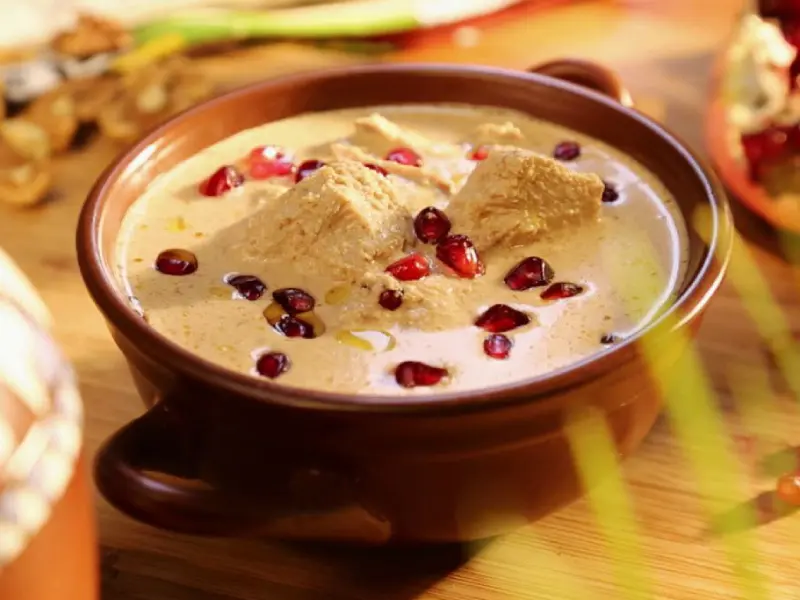 Сациви – еще одно традиционное блюдо праздничного стола. Его готовят из курицы под сливочным соусом с орехами, шафраном, корицей и гвоздикой. Это главное блюдо на Новогоднем столе.