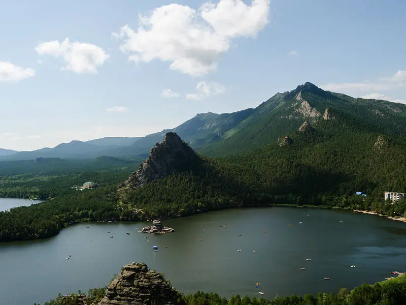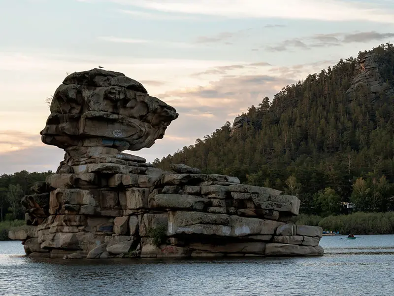 Burabay or Borovoe can be described as one of the most beautiful places in Kazakhstan. The territory including more than fourteen lakes got the status of a national park in 2000. It is the favorite summer recreation zone for locals to swim in the lakes, for hiking, camping and boat rides.
