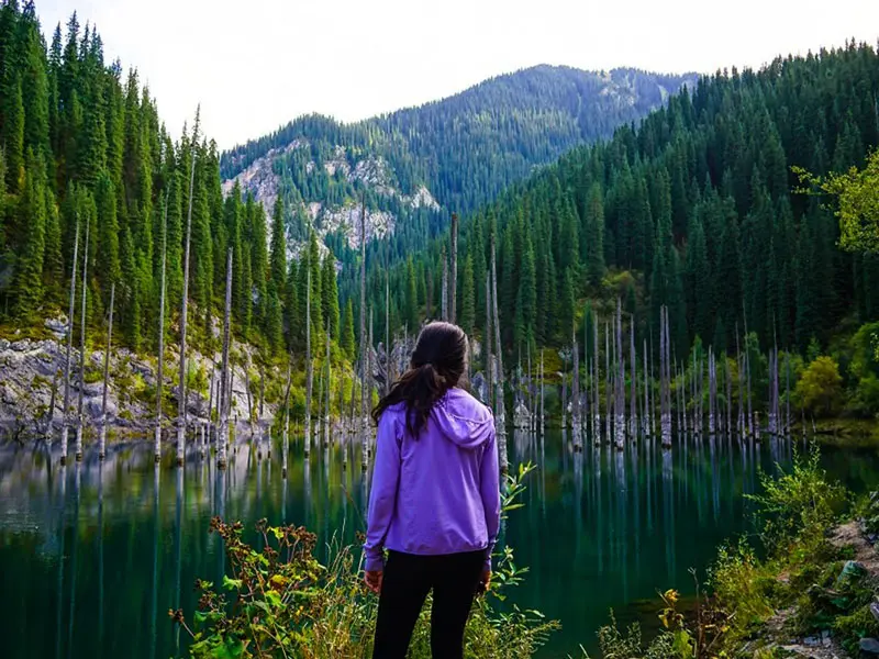 From the village of Saty 15 km the trek to the southwest takes to Kolsai and another trek takes to the southeast to Kaindy Lake. It is relatively a young lake that appeared after the earthquake in 1911. The natural dam appeared and the melted glacier water had no way to flow out. Shrenk spruce forest was sunk under the water and now the trees stand in the water like the ghosts of the forest.