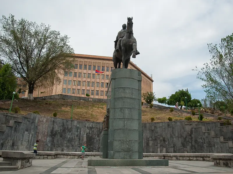 The monument to Hovhannes Baghramyan was opened on May 24, 2001 on Bagramyan Avenue, Yerevan, with the assistance of the Ministry of Defense. Marshal is depicted on a battle horse. The sculptor of the monument was Norayr Karaguzian.