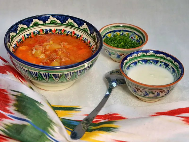 Soup is an important part of the meal. Sometimes it is served as the main course. Tajik soups are very thick and filling with a lot of tomatoes, spices, and sour-milk products. As a rule, soups are cooked with fatty broth and pieces of meat. Soups like shorba and urgo are served in oval-shaped bowl pialah, kasa or tavak.