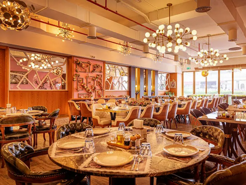 The posh interior of the restaurant is made in black and golden tones with leather sofas, a golden ceiling, and luxurious chandeliers. The domes of the restaurant are decorated with colorful oriental mosaics. The menu includes all the dishes of traditional cuisine, as well as dishes of European and continental cuisines.