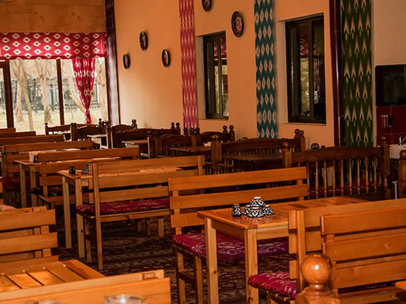 Another great place to taste dishes of traditional Uzbek cuisine is Plov Samsa restaurant and chaykhona. The simple and cosy interior of the restaurant is just perfect to enjoy dinner. The first hall is decorated with wooden tables and chairs with smooth kurpaça. The second hall is more private; the tables are separated with curtains. All the atmosphere is completed with oriental music. In the warm season, the veranda is transformed into an open-air yard with flowers.
