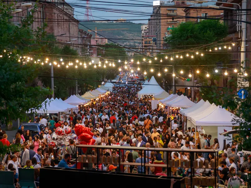 The Yerevan Wine Days Festival is an annual event held on the first Friday, Saturday, and Sunday of June on the streets of Moskovyan, Tumanyan, and Saryan. It is the largest wine festival in Armenia. The organizer is "EventToura" (an agency for the development of event tourism). In 2023, the festival was attended by more than 120,000 people. Its aim is to promote wine tourism in Armenia. The festival involves more than 70 winemakers and over 30 food-producing companies. Every year, this number increases, and the event begins to include more participants and partners. The festival offers not only wine tasting but also educational and social events accompanied by music. Entrance to the festival is free, but it is worth noting that special packages are required for wine tasting. Visitors can freely move around the entire area, interact with winemakers, taste wines from various wine companies, explore more than 600 types of wine, and attend concerts. In 2022, the festival was recognized as the event of the year at the Wine Travel Awards 2021-2022 international ceremony held in London.