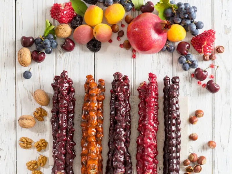 Churchkhela is considered the traditional sweetness of Georgian cuisine. It looks very similar to the Armenian sujukh, but they are completely different in taste. Sujukh is made only from walnuts and with aromatic gruel, Georgian churchkhela is made from hazelnuts and walnuts, while grape juice has a brighter fruity taste.