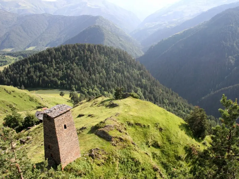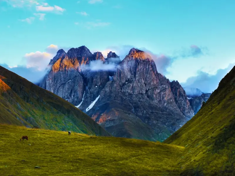 The entire territory of the park is all about hard-to-reach passes, mountain peaks, and powerful cliffs, alpine meadows and gorges with rivers. Fascinating landscapes are complemented by the authenticity of small settlements, views of the ruins of fortresses, ancient graves, and towers of Tusheti.