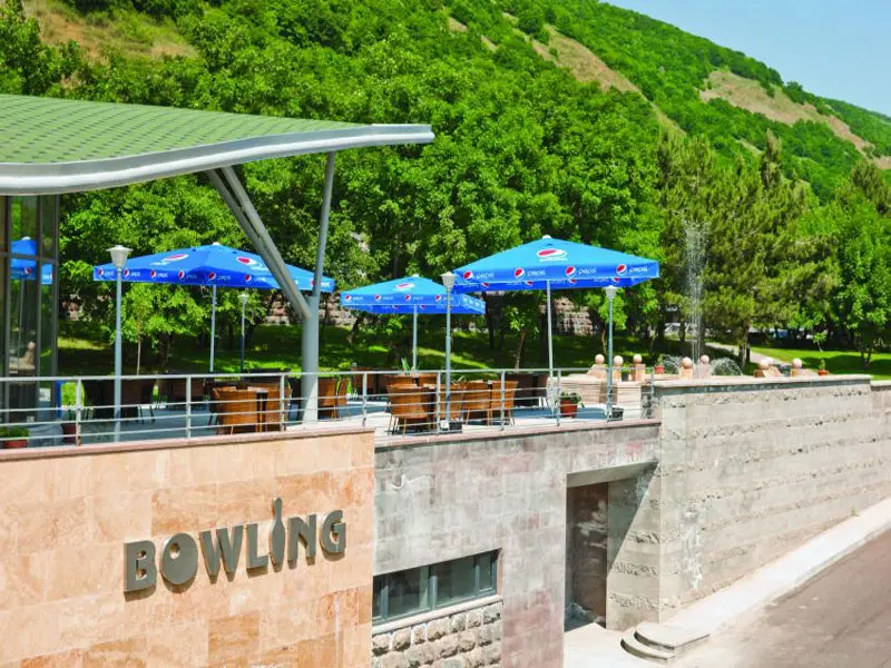 Here there are good conditions for both indoor and outdoor rest. The big territory of the complex provides an opportunity for open-air swimming pool, open-air café above the bowling center, with a view of a fountain in front of it. There is also a special rest-zone at the banks of the river, where several pergolas are located. The place is equipped with all the necessary facilities and is a perfect place for family picnic. While making preparations for barbecue, children can play on the special playground.