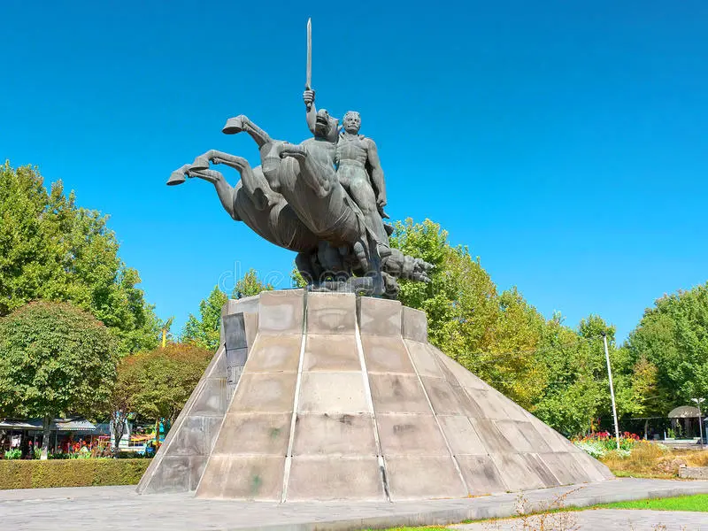 Monument to Zoravar Andranik was placed in 2002 in front of the Cathedral of St. Gregory the Illuminator. The statue features Zoravar Andranik with a sword in his hand riding two horses. Two horses symbolize separated Armenia. Zoravar Arndranik fought his whole life for the reunion of his country.