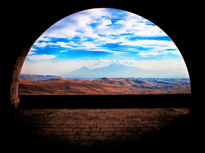 Двойная арка из камня основана на вершине холма, к ней ведут небольшие ступеньки. Находясь под аркой, вы насладитесь видом на величественную гору и изумительный пейзаж. На самой арке выбиты известные слова из произведения Чаренца: