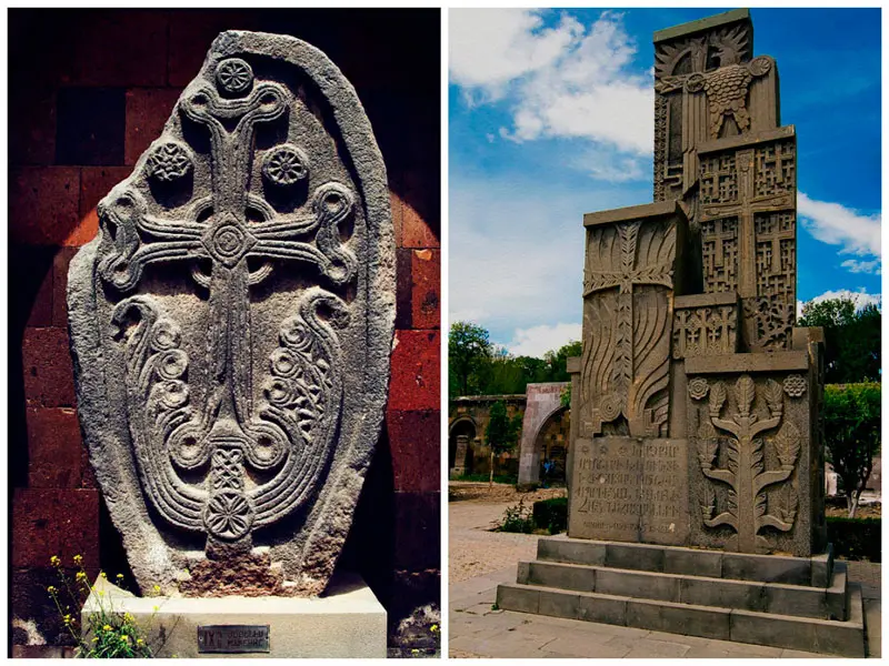 В известном городе Эчмиадзин, религиозном центре всех армян и резиденции католикоса Армянской Апостолькой церкви, а именно на территории Кафедрального Собора можно посмотреть интересные древние хачкары, среди которых особо выделяется хачкар жертвам геноцида, а также хачкар-скульптура символизирующая жизнь армянского народа (на фото справа):