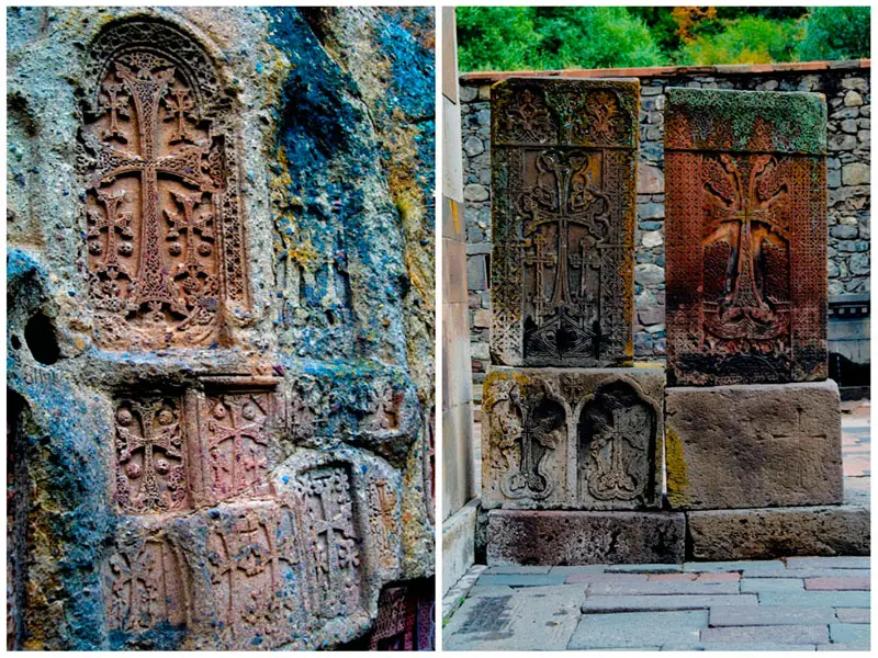 Хачкары на территории скального монастырского комплекса Гегард уникальны. Некоторые из них выдолблены в скалах вблизи келий, некоторые находятся непосредственно рядом с храмом. Из них немногие относятся к раннему средневековому периоду, а большинство датировано XI-XIII вв. Надписи на них показывают, что монастырь Гегард когда-то имел важное значение в стране. А их удивительный красноватый цвет получали в результате нанесения красной краски, получаемой от определенного вида червей. Эта уникальная краска невероятно долговечна: той, которую вы увидите на хачкарах, уже 800 лет! Неслучайно, что ее вывозили заграницу на экспорт, и в Европе и странах Дальнего Востока она ценилась выше золота.