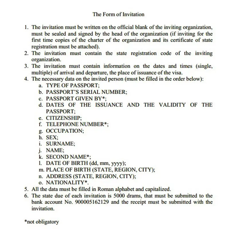 Ниже вы можете ознакомиться со списком стран, граждане которых могут получить визу в Армению только по приглашению. Приглашение этим гражданам может выдать зарегистрированные в Армении юридические лица, власти Армении, дипломатические представительства, международные организации и их представители. Приглашение должно быть обязательно написано на официальном бланке, иметь подпись директора, а также печать организации. Представляются приглашения для рассмотрения в Министерство иностранных дел Армении.