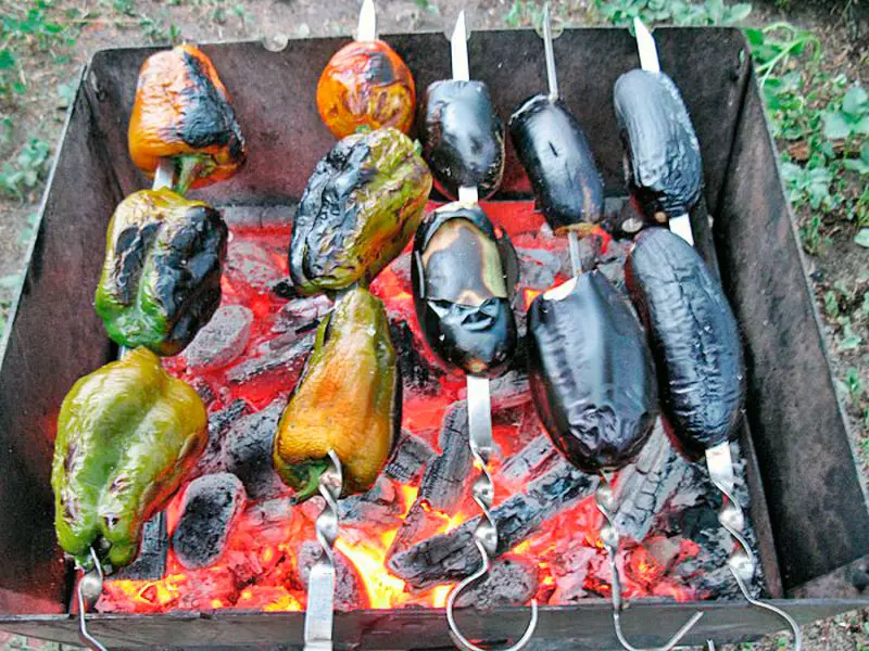 Поджарьте овощи над огнем, пока они не обуглятся и не станут мягкими. Не забывайте переворачивать. Очистите готовые овощи от черной кожуры, а затем нарежьте небольшими кусочками. Добавьте к овощам мелко нарезанный лук, зелень, посолите, поперчите и заправьте растительным маслом. Вот и все!