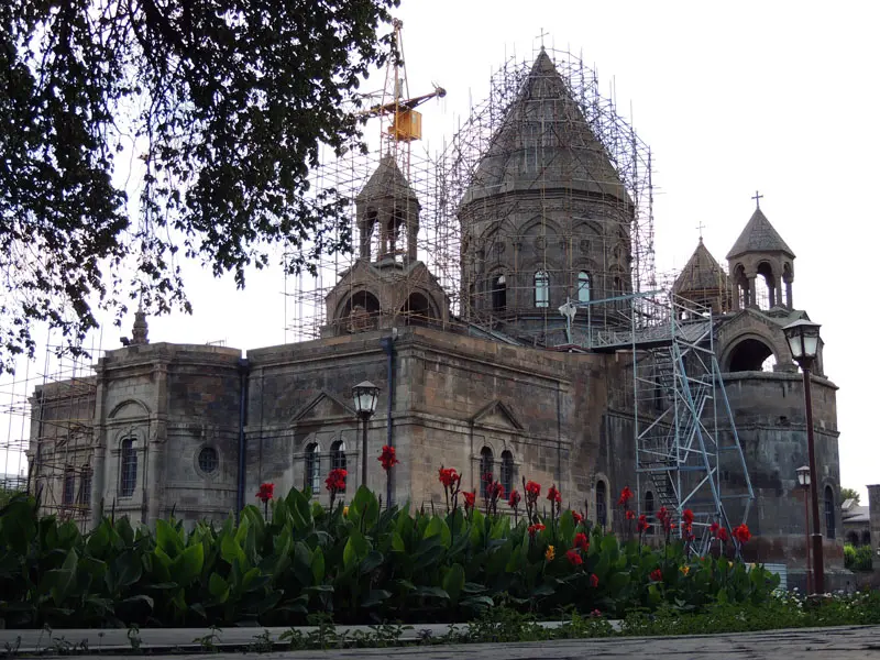 С каждым часом пребывания в Армении мы все больше узнавали о ее истории, которая неразрывно связана с историей христианства, ведь именно в Великой Армении в 301 году христианство впервые было принято в качестве государ- ственной религии. В Эчмиадзине находится резиденция Католикоса всех армян и Эчмиадзинский кафедральный собор (переводится как «Сошествие Единородного») — главный храм Армянской апостольской церкви. Согласно легенде, место для возведения храма Святому Григорию Просветителю указал Иисус Христос. Собор был построен в IV веке и с 2000 года входит в список Всемирного наследия ЮНЕСКО. В музее при соборе хранятся реликвии и святыни, среди которых — частица Ноева Ковчега и Гегард — Копье (копье, пронзившее Христа).