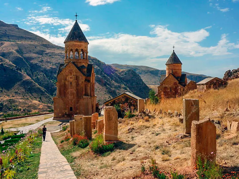 Немного истории. Монастырь Хор Вирап был государственной тюрьмой, в которую был заточен святой Григорий, исповедовавший христианство и отказавшийся по приказу царя обратиться в язычество. Григорий провел около 15 лет в глубокой яме Хор Вирапа, однако чудесным образом выжил (в яму можно спуститься и сегодня). Григорий исцелил правящего царя Трдата, обратив его в христианство. Царь освободил Григория, нарек титулом «Просветитель» и сделал его государственным советником. После этих событий Армения стала христианской. Заключительная точка нашего путешествия — дорога через узкий каньон в долину красных скал, где возвышается монастырский комплекс Нораванк (основан в XIII веке). Это — жемчужина армянской религиозной архитектуры на фоне неземных пейзажей — отвесных красных скал ущелья реки Арпа. Две великолепные церкви и часовня, множество каменных хачкаров с изображением цветущего армянского креста, вос- хитительные виды на живописную местность отличают Нораванк. Это тот редкий случай, когда известен автор строений — знаменитый архитектор и скульптор Момик.