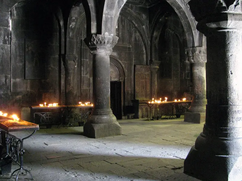 Мы выехали за пределы столицы и оказались в Гегардаванке — переводится как «Монастырь копья». По легенде, здесь хранилось копье, которым был пронзен Христос, когда был распят на кресте (оно на- ходится сейчас в Эчмиадзине). Этот совершенно необычный монастырь, основанный в IV веке, — пещерный, и тоже входит список Всемирного наследия ЮНЕСКО. Часть храмов, кельи Гегарда полностью выдолблены внутри скал, другие состоят из обнесенных стенами помещений, комнаты которых расположены глубоко внутри утеса.