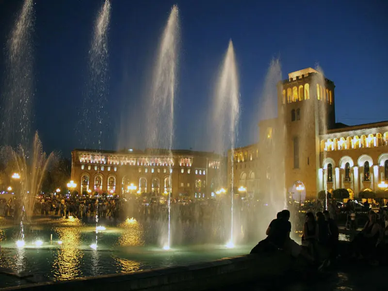 Ереван – уютный “розовый” город, история которого простирается на 2790 лет назад. Ереван прекрасен и днем и вечером, но все же вечерний город имеет, особую привлекательность. Везде зажигаются огни, и можно поехать в самый центр столицы и посетить ее “сердце”- Республиканскую Площадь. Каждый день, начиная с мая по октябрь, на площади собирается множество людей, желающих полюбоваться красочными и впечатляющими музыкальными фонтами. Эти поющие фонтаны – любимая достопримечательность как местных жителей, так и туристов. Программа включает в себе классические шедевры, национальную музыку, современный поп и рок, а в конце всегда звучит песня Шарль Азнавура “Вечная любовь”. Шоу настолько увлекательное и романтичное, что хочется приходить сюда снова и снова. В вечернее время можно также отправиться к театру Оперы, где всегда собирается очень много народа, вокруг сплошные уютные кафе, и также есть просторная площадка, где можно покататься на роликах. Еще одним местом, восхищающим своих посетителей в вечернее время, является Северный проспект. Здесь можно прекрасно погулять, посетить уютные кафе и рестораны, вокруг играет музыка и ощущение, что ты попал на праздник.
