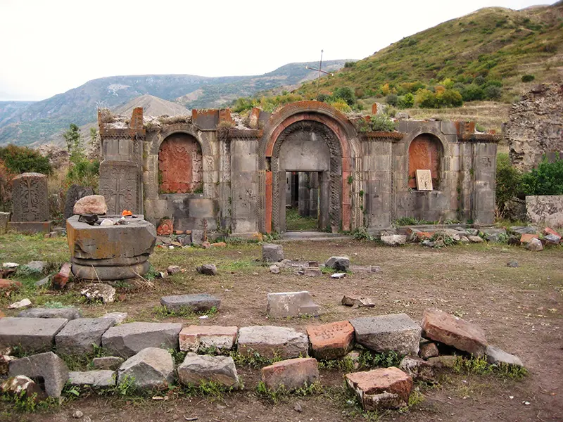 Древнее построение стоит на холме, из монастыря открывается восхитительный вид на языческий храм и ущелье. Главная церковь комлекса, Аменапркич, сильно пострадала во время землетрясения в 1679 году. Сейчас от нее остались только развалины – арка, стена и алтарь. Несмотря на разрушенные стены, монастырь выглядит гармонично на фоне гор и ущелья.