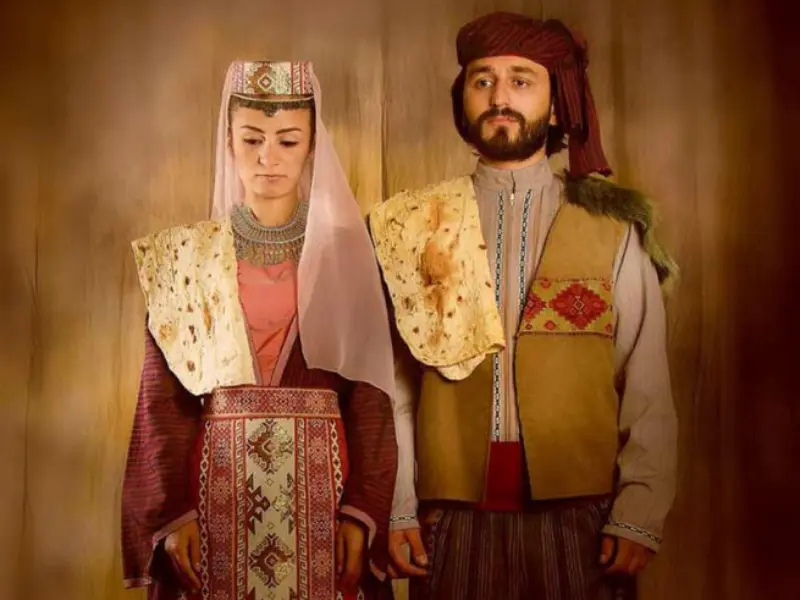 Главная ценность армянского народа – семья и семейные узы. Почти все традиции и обычаи связаны с семьей, и начнем мы со свадебных традиций. Традиционная армянская свадьба отмечалась всем селом. Главный гость на свадьбе – это «кавор» (крестный отец). Согласно обычаю, жених, «азаб баши» (неженатый друг жениха) и несколько гостей приезжают в отчий дом невесты под громкую музыку и бой барабанов. Впереди колонны машин едет «ахвес» (гонец), оповещающий всех о свадьбе. В давние времена ахвес крал из дома жениха курицу и первым приходил в дом невесты, чтобы сообщить о приходе гостей. Невесту одевают женщины в закрытой комнате под пение крестной матери. Одна интересная и веселая традиция – это кража туфли невесты. Тот, кто украл туфлю, получает денежное вознаграждение от крестной матери. После поздравления и тостов пора выводить невесту из дома, и тут на пороге их встречает брат невесты с кинжалом у двери. Чтобы пропустить, кавор должен заплатить выкуп. Наконец, вся колонна двигается в церковь для венчания. Одна из традиций венчания – это короны для жениха и невесты и вино, как символ крови Христова. После венчания гости едут в дом жениха, где новобрачных встречает новоиспеченная свекровь с лавашом и медом. Веселой традицией является борьба между свекром и свекровью перед гостями. Жена, конечно же, проигрывает в борьбе, и в знак повиновения целует мужа. Наконец, начинается веселье и танцы до поздней ночи.