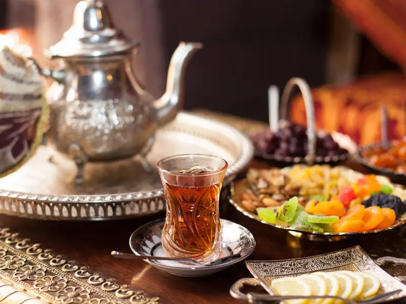 Азербайджанцы также славятся своим гостеприимством. Так, в селах до сих пор сохранился обычай встречи гостей. Если это особый гость, народ собирался в селе и делился на две группы. Во главе стояли старейшины с подарками – хлеб, соль, зеркало, щербет и сладости. Все подарки заворачивались в красную ткань. Гостей встречали в национальных одеждах с песнями и танцами. Чаепитие – это главная и важнейшая церемония. Чай подают до и после обеда со сладостями, вареньем и кусочками сахара, и отказываться от чая – это значит глубоко оскорбить хозяина.