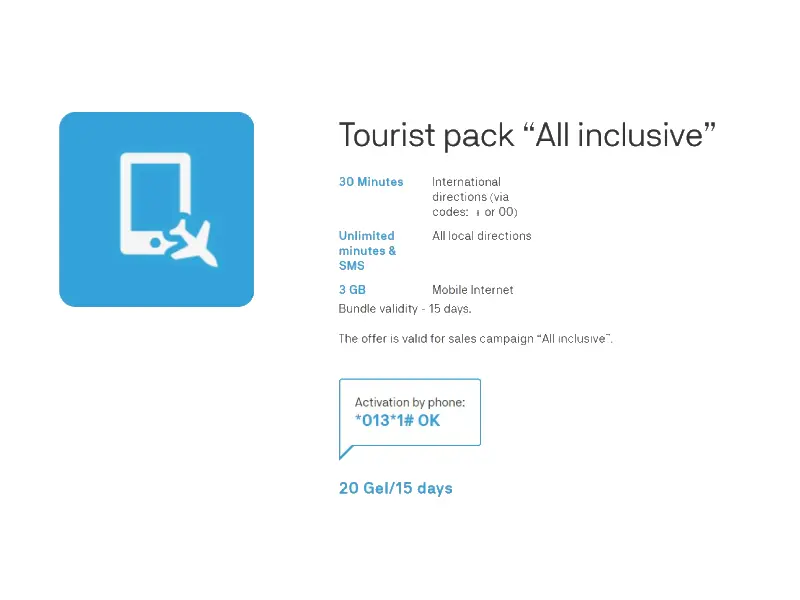 У компании есть хорошее предложение для туристов – пакет “Все включено” (All Inclusive), который можно активировать, нажав *013*1# OK. Пакет стоит 20 лари и действует в течение 15 дней. Активировав пакет, вы получаете неограниченное количество минут для звонков внутри страны, 30 минут для звонков заграницу, а также 3Gb мобильного интернета.