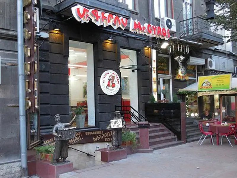 The other quite popular place is the restaurant Mr. Gyros – a Greek fast-food chain. The main dish of the restaurant is “Gyros”, which is very similar to shawarma. The prices of this dish vary from 650 to 1200 AMD ($ 1,35 – 3,5), which depends on the type of meat you prefer and the size. Here you can choose either chicken, pork or beef. The dish is served with fresh vegetables, French fries, and sauce. However, that’s not all, the restaurant also offers various sandwiches and salads as a garnish. For the dessert, you will find extremely delicious ice cream drizzled with hot sauce (strawberry, chocolate, caramel), or Greek pie with cinnamon – Kanelopita. The atmosphere and the interior are pleasant and cozy, everything is painted in white and red colors, and walls are covered with pictures representing beautiful corners of Greece. For those who are with children, there is a kid’s playground. (Mr. Gyros can be found at Tumanyan 21/1, Tumanyan 40, Komitas 56/9, Mashtots 5, Teryan 62a).