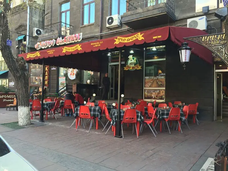 On the same street (Tumanyan 21) you can find a very popular eatery “Mer Tagh”, which is translated as “our yard”. This place is mainly visited because of its tasty lahmajoon – thin dough covered with minced meat and fried in an oven. “Mer Tagh” will not surprise you with an exquisite interior or various dishes. However, lahmajoon here is so tasty, juicy and at the same time crispy, that the place gained wide popularity. The service is so quick, that you have to just make an order – and your freshly baked lahmajoon with lemon slices will be on your plate! Some people order lahmajoon in a special package to takeaway. According to the waiter, after freezing this dish can be taken even to Europe and Russia for family and friends. One piece will cost about 720 AMD ($ 1.5). Generally one can take 2 lahmajoon to feel satisfied. The eatery also offers fast food, but it is not so popular.