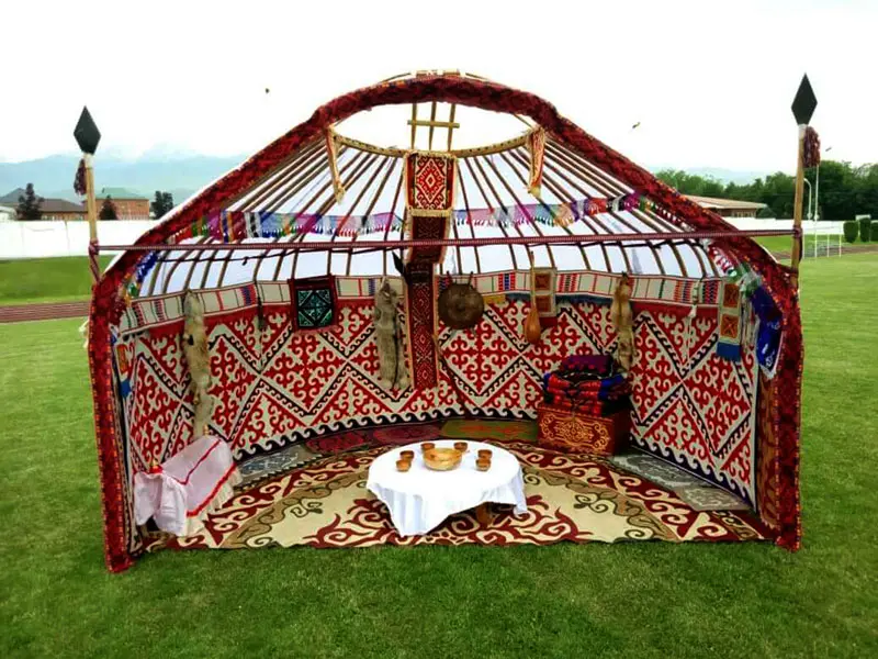 One of the original restaurants of national cuisine is Yurta. It is located in one of the most picturesque places of Almaty, in Koktobe park, in the foothills of the Zailiysky Alatau ridge. The name of the restaurant speaks for itself. The huge yurt has several halls with wooden furniture. The walls are decorated with ornaments, carpets, and furs. The soft pouffe chairs are perfect to enjoy a delicious dessert and a cup of tea.