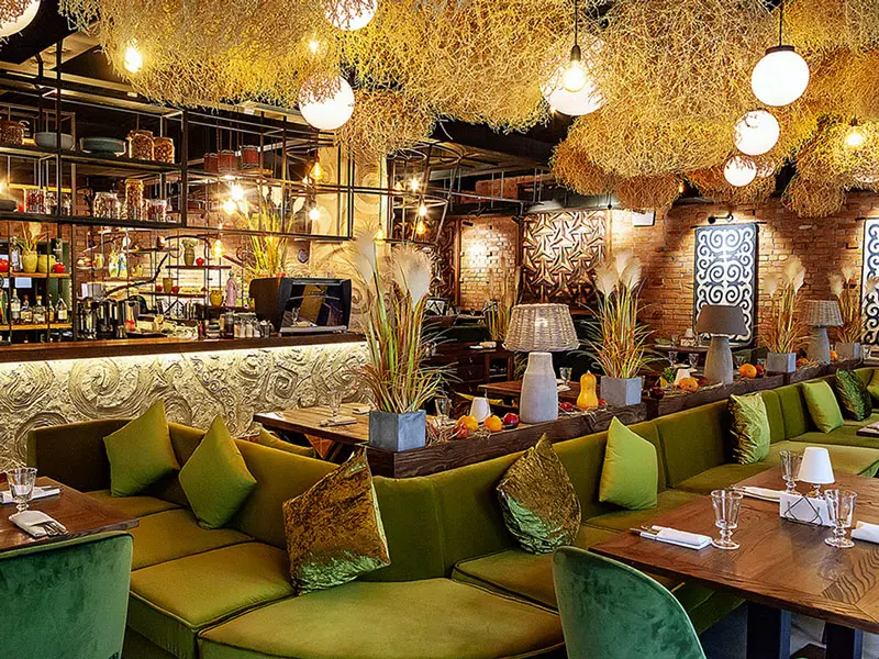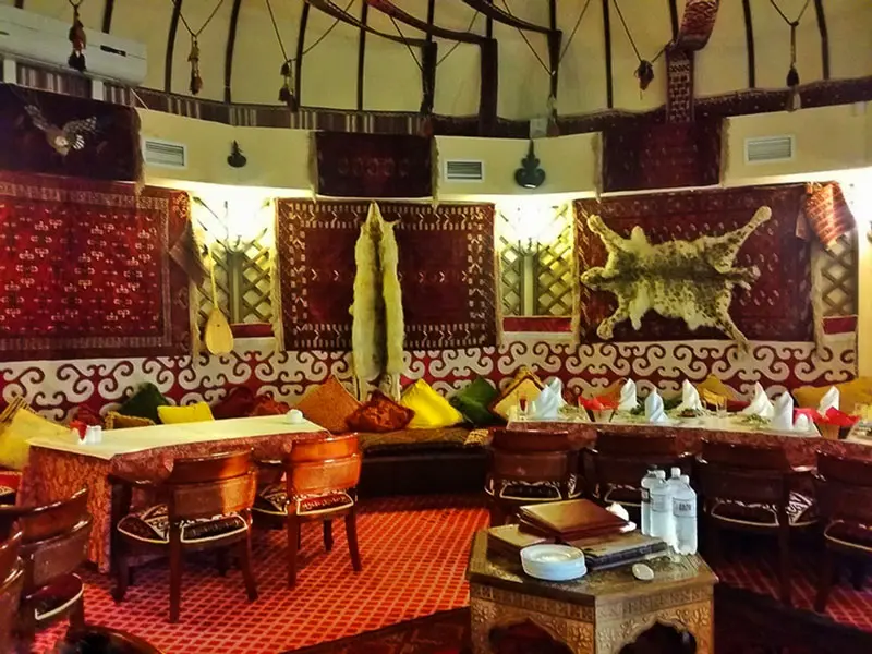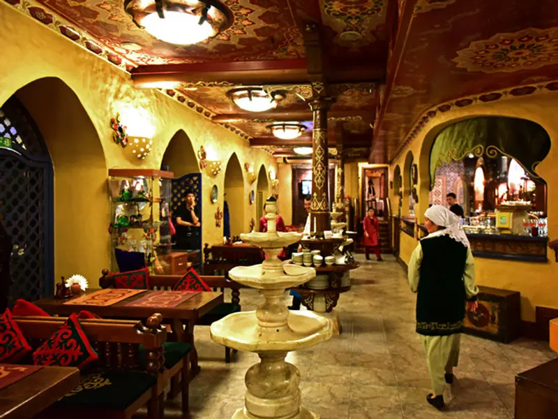 Another popular restaurant that will impress guests with rich interior and dishes of national cuisine is Zheti Kazyna. The name of the restaurant is translated as Seven treasures and indeed Zheti Kazyna is a real treasure. The facade of the restaurant immediately catches attention with its bright yellow walls decorated with traditional ornaments in blue. The interior of the spacious restaurant is a mixture of styles of eastern cultures including Kazakh, Uzbek, and Chinese. The menu interprets the versatility of styles; signature dishes of the restaurant are Uzbek pilaf and Kazakh beshbarmak with horse or lamb meat.