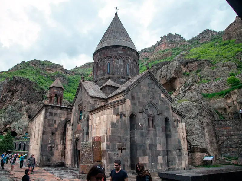 The next day you can make a trip to the cave monastery of Geghard of the 13th century, which is located 40 km from Yerevan. This unique monastery is carved into the rock and the surrounding rocks form part of the complex. In 2000, it became a UNESCO heritage site. You can get to the monastery by your own car, take a taxi, rent a car or take bus number 284 which departs from the Yerevan bus station located behind the Mercedes car dealership. Get to the Goght village by bus and then you can walk to the monastery or hitchhike. The distance between the village of Goght and Geghard Monastery is about 4 km. Those who wish can drive to the village of Garni, where the famous Hellenistic temple of Garni and the unique natural monument Symphony of Stones are located. From Garni you can take a taxi to Geghard or hitchhike.